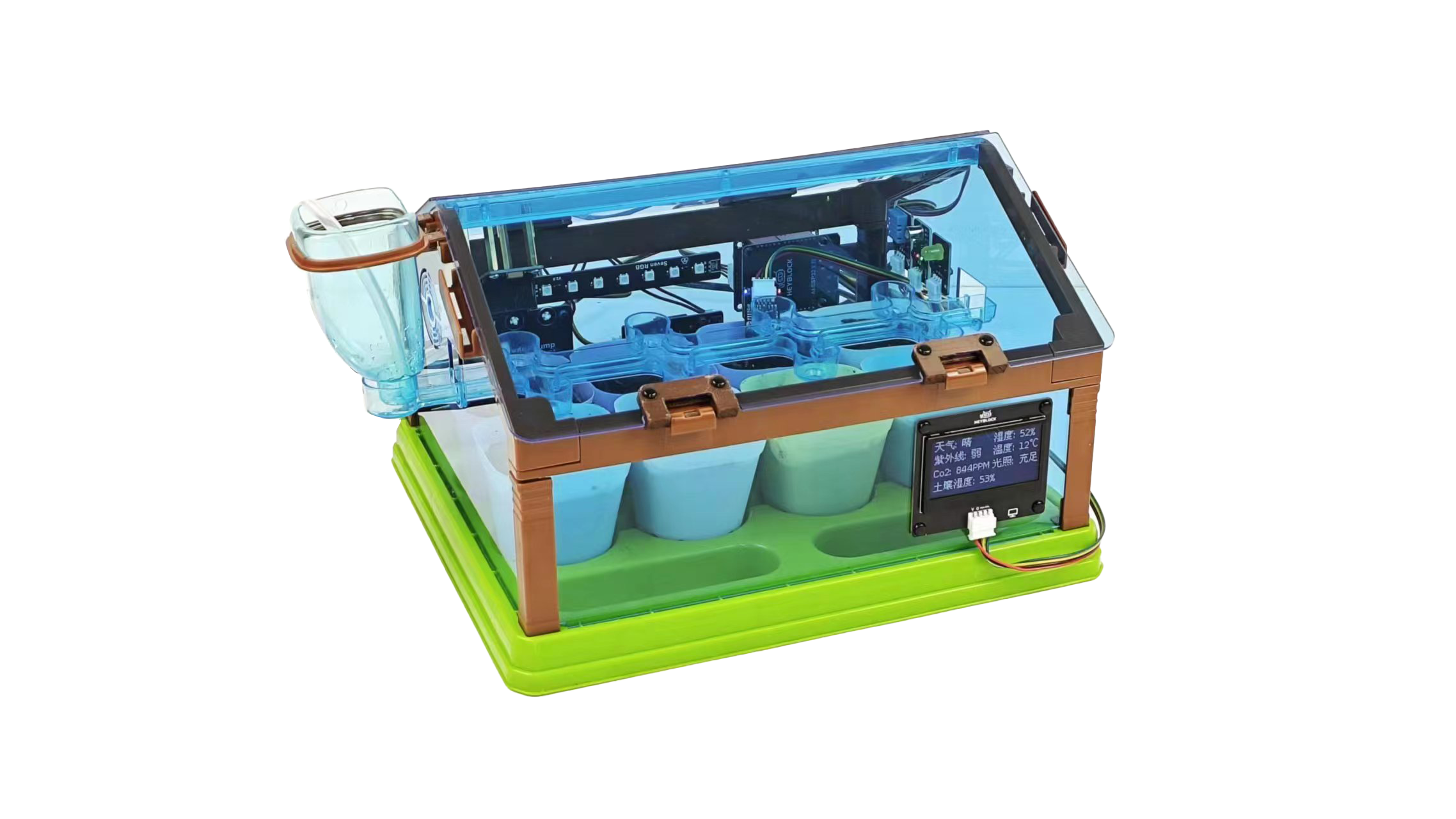 2、AI智慧農(nóng)場(chǎng)可(kě)根據圖形化編程可(kě)實現相(xiàng)應的(de)功能(néng):第一,農(nóng)場(chǎng)環境檢測功能(néng),包括CO2、土(tǔ)壤濕度、光(guāng)照(zhào)強度、溫度、濕度、雨水(shuǐ)等環境參數監測,同時還能(néng)一起将環境參數實時顯示在2.4寸OLED屏幕上(shàng);第二,能(néng)根據土(tǔ)壤濕度檢測的(de)數值參數進行(xíng)自動滴灌補水(shuǐ)、根據光(guāng)照(zhào)強度進行(xíng)室内自動不光(guāng)、根據室内濕度情況進行(xíng)自動排風等功能(néng);第三,AI智慧農(nóng)場(chǎng)還可(kě)利用(yòng)手機APP進行(xíng)遠程交互控制(zhì),包括在手機APP查看當前農(nóng)場(chǎng)環境參數,并利用(yòng)手機APP對農(nóng)場(chǎng)進行(xíng)相(xiàng)應的(de)功能(néng)控制(zhì),包括補光(guāng)、補水(shuǐ)、排風等。