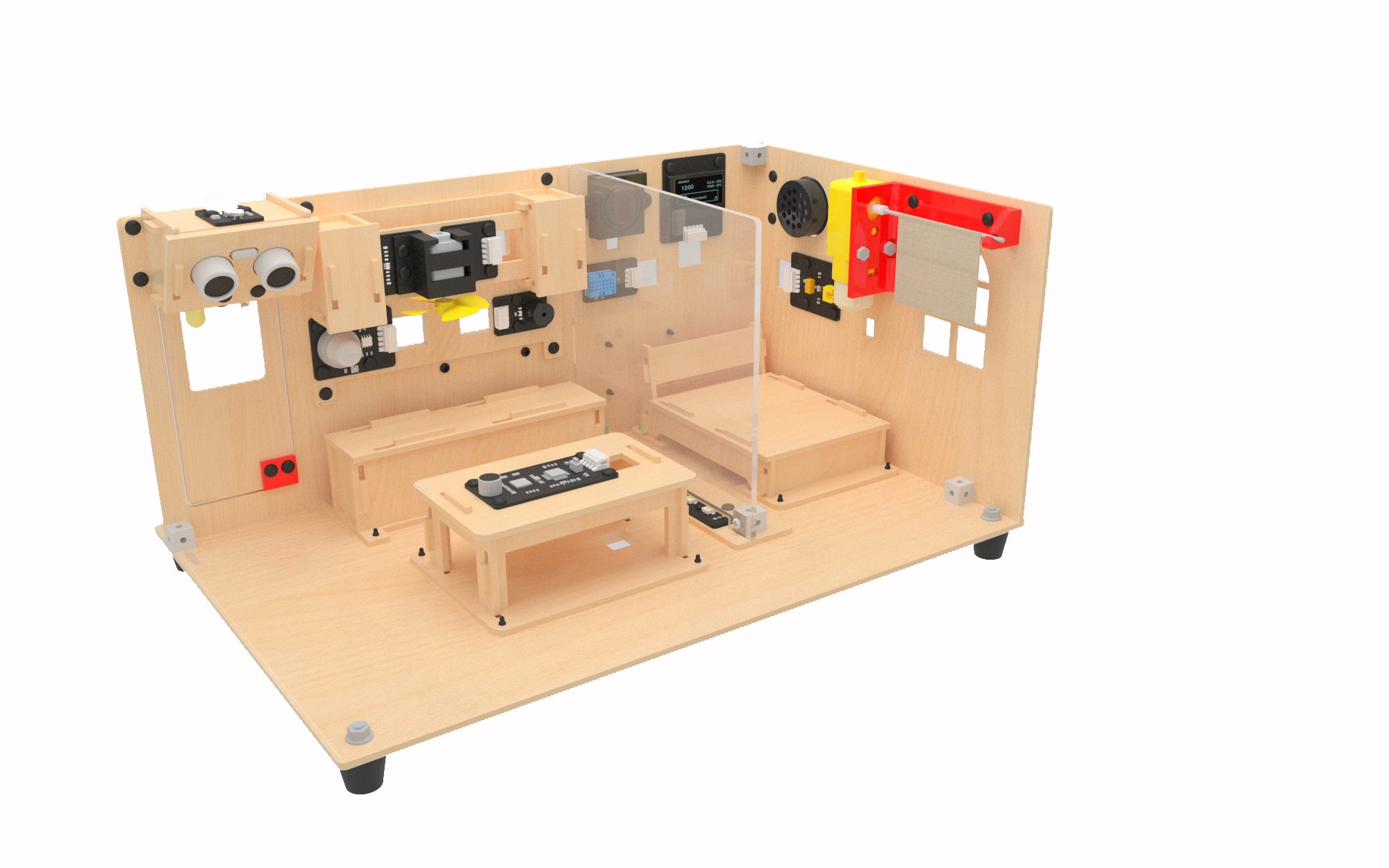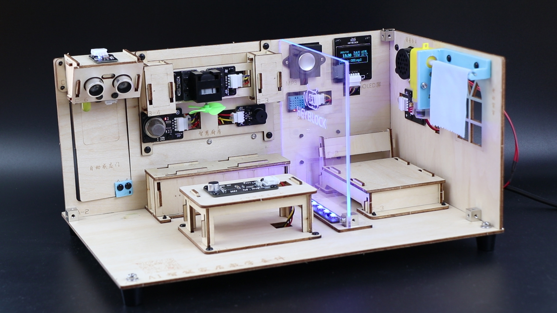 AI智能(néng)家居教學套件(jiàn)由AI主控闆、擴展闆、傳感器(qì)與智能(néng)家居結構套裝所組成,整體的(de)AI智能(néng)家居結構由各個(gè)AI功能(néng)模塊所組成,模塊項目之間相(xiàng)互獨立,可(kě)進行(xíng)模塊化項目式拆裝,整體場(chǎng)景可(kě)實現人(rén)工(gōng)智能(néng)語音(yīn)交互控制(zhì)、物(wù)聯網手機APP通過WIFI進行(xíng)遠程控制(zhì),以及人(rén)體交互感應控制(zhì)等功能(néng),套件(jiàn)所含的(de)所有(yǒu)傳感器(qì)可(kě)整體同時一起連接在1塊主闆上(shàng)進行(xíng)功能(néng)實現。